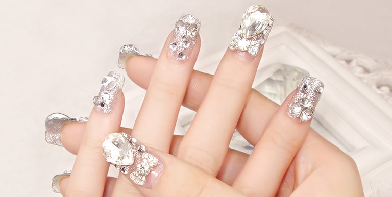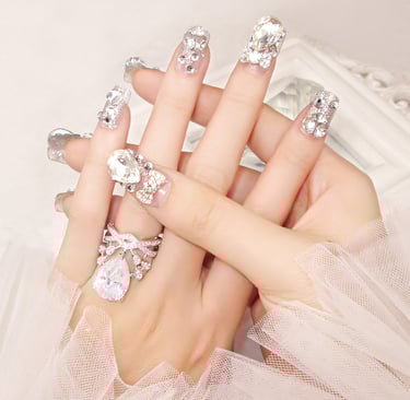 Features hand-applied rhinestones, faux pearls, and 3D embellishments like flowers or bows. These elements are carefully placed onto the nails using gel or acrylic for a luxurious, long-lasting finish